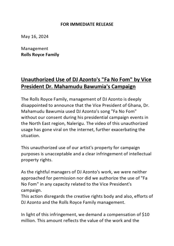 The management bemoaned that the action disregards the creative rights body and also, efforts of DJ Azonto and the Rolls Royce Family management.