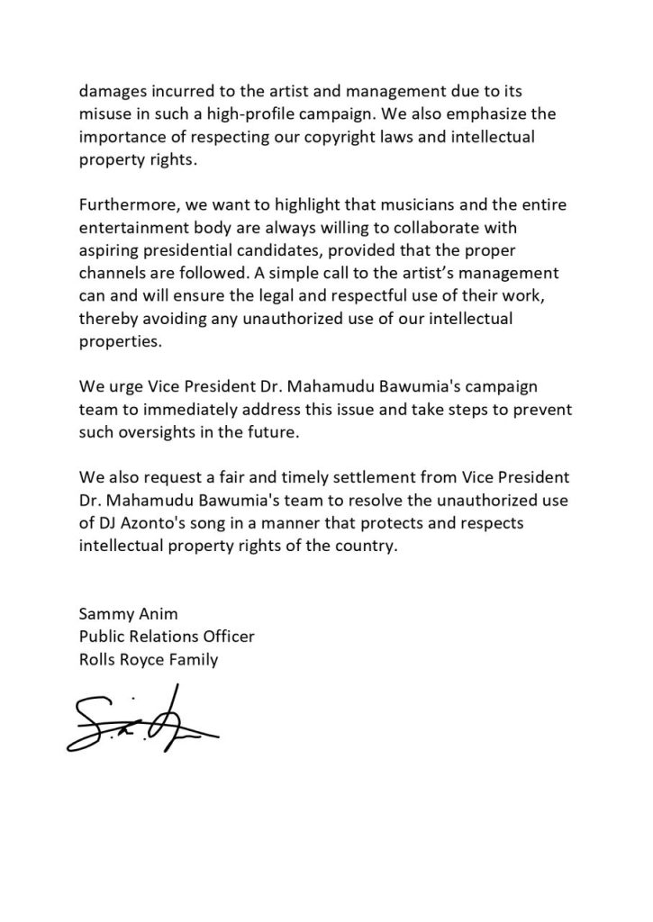 The management of DJ Azonto also called on the campaign team of Dr Mahamudu Bawumia to address the issue immediately and take steps to prevent such oversights in the future.