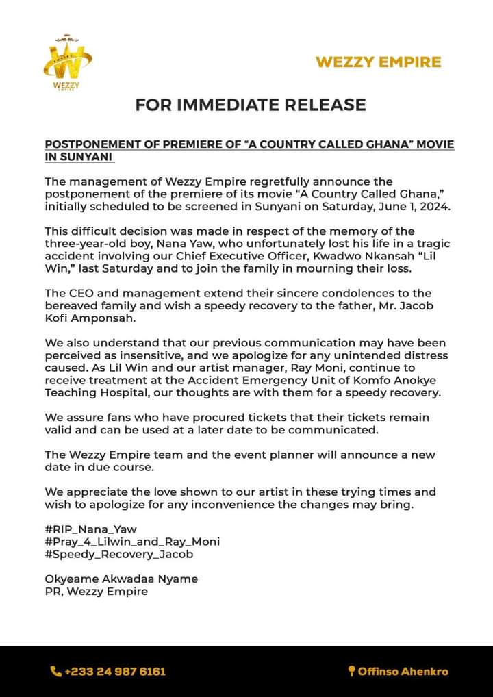 But following the death of a 3-year-old boy, Tawiah Ampoma Richard, in Lilwin’s car accident which happened on Saturday, May 25, 2024, it has been postponed.