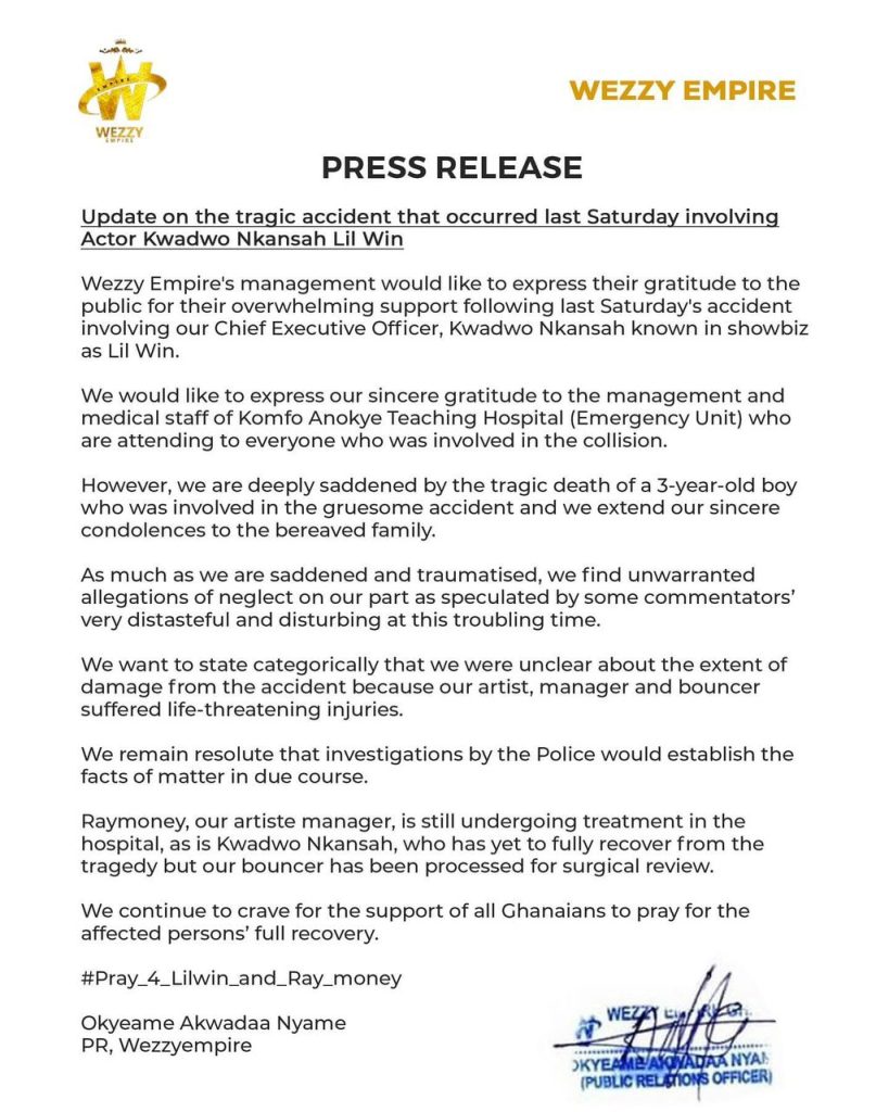 The management of Ghanaian actor, Kwadwo Nkansah, popularly known as Lilwin, have reacted to the death of a 3-year-old boy in his car accident.